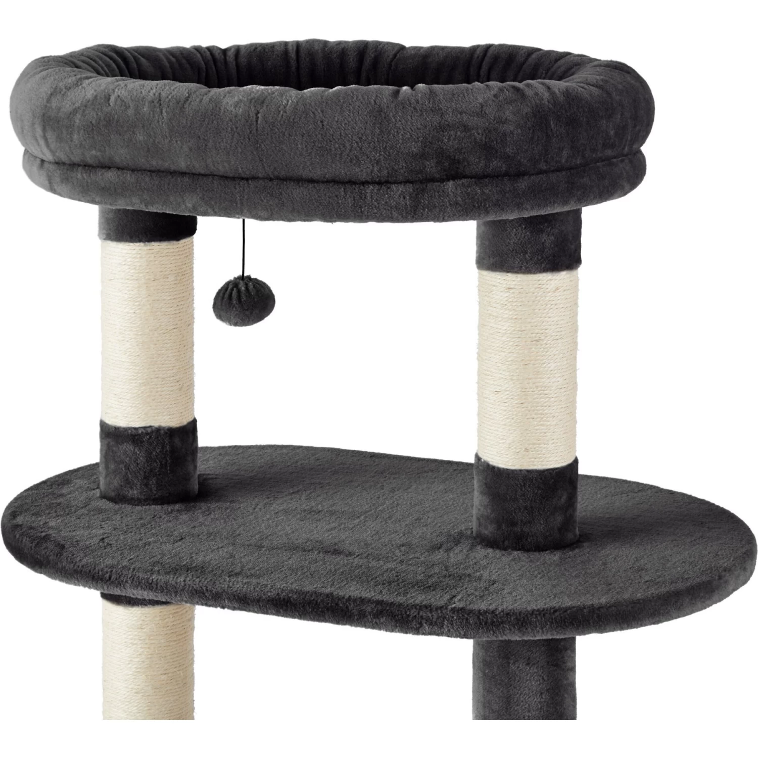 - High perch has a removable, machine washable cover and a dangly pom-pom toy attached.