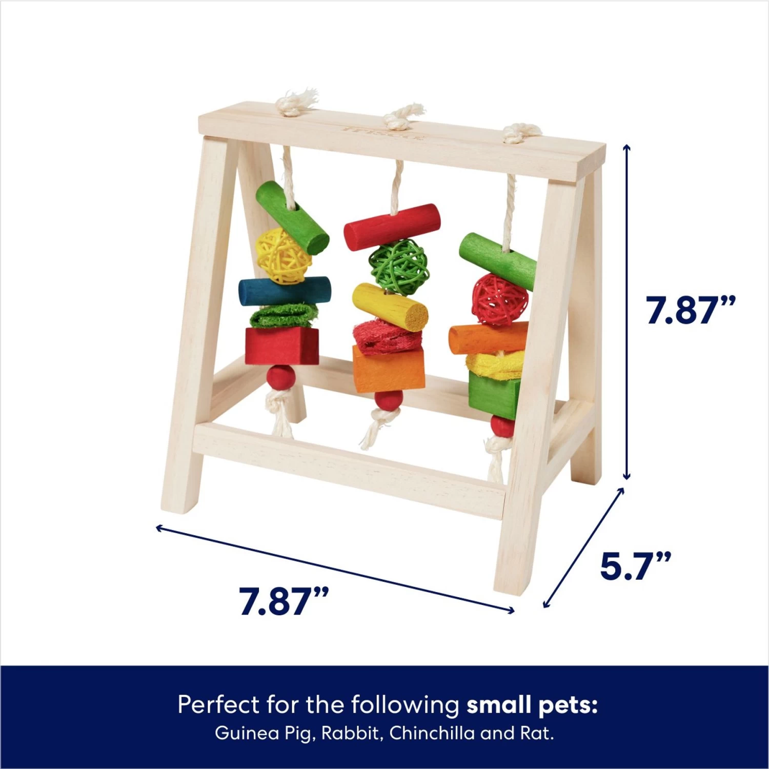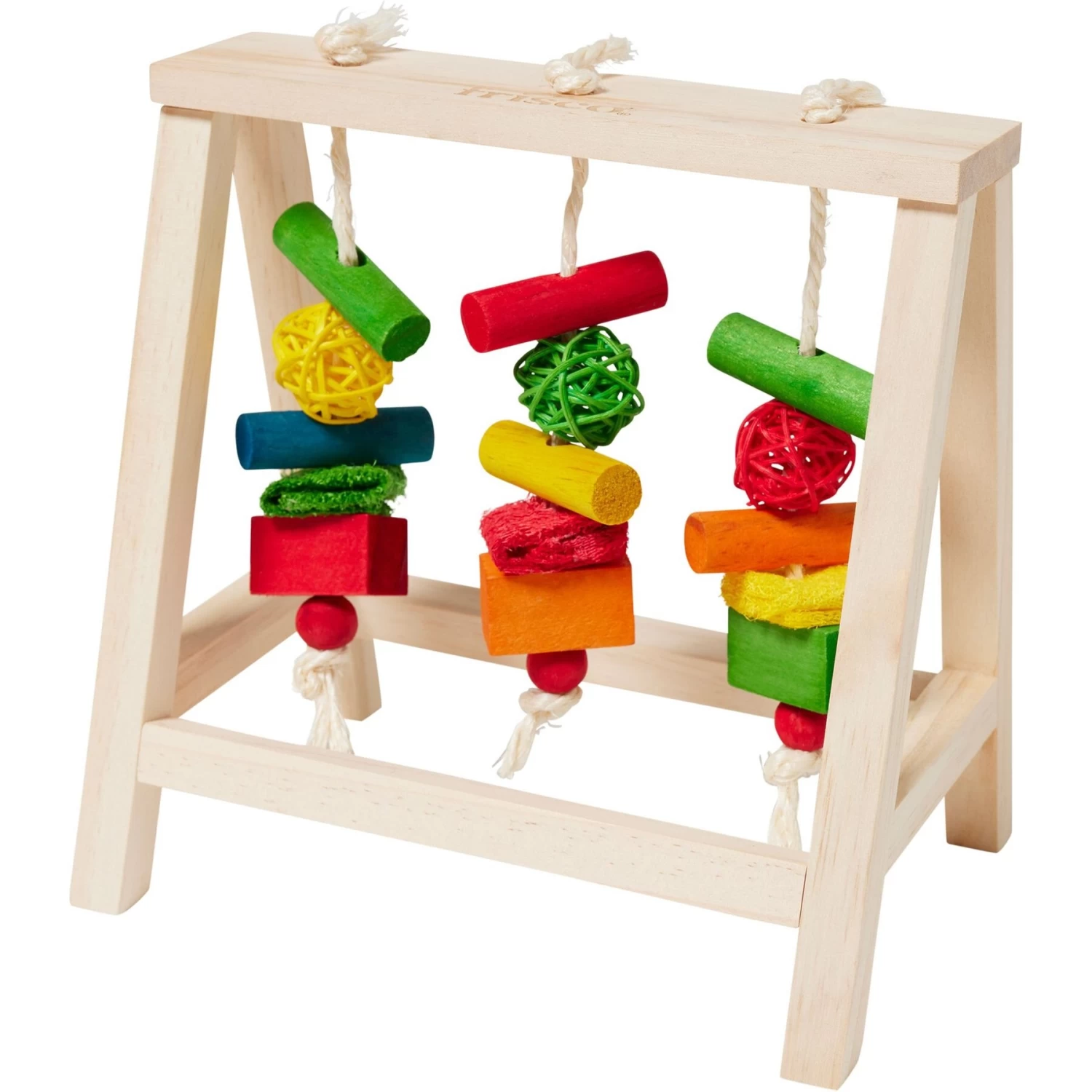 - This toy table has wooden posts and dangling kebab-like toys to entertain your pint-sized pet.