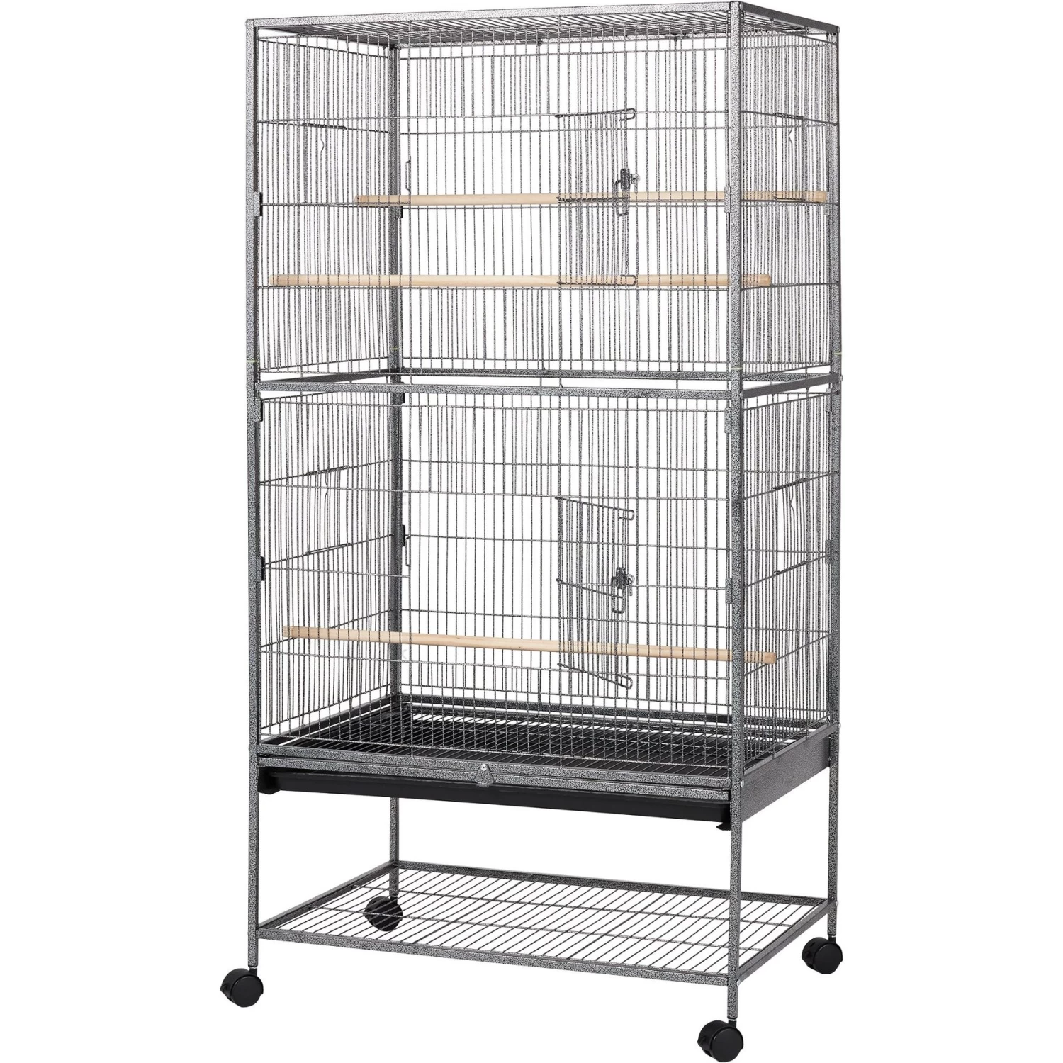 - Metal cage features three wood perches, a removable plastic tray for convenient and easy cleaning, as well as four locking wheels for transporting or to keep this cage in place.
