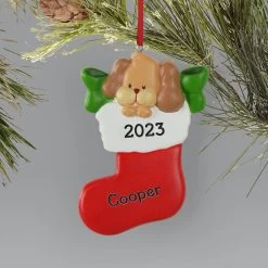 - Features a cute little dog face popping out of the top of a stocking.