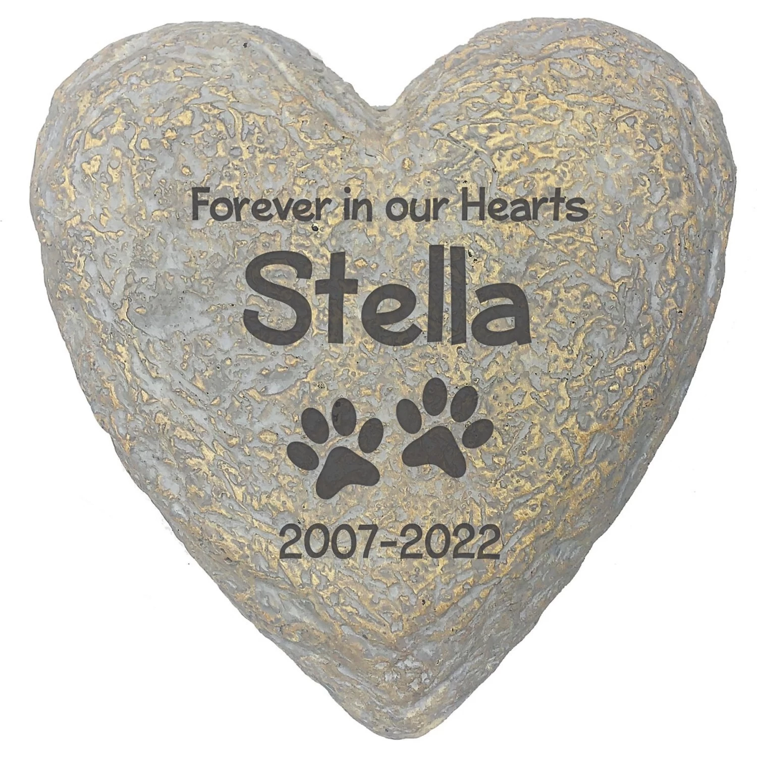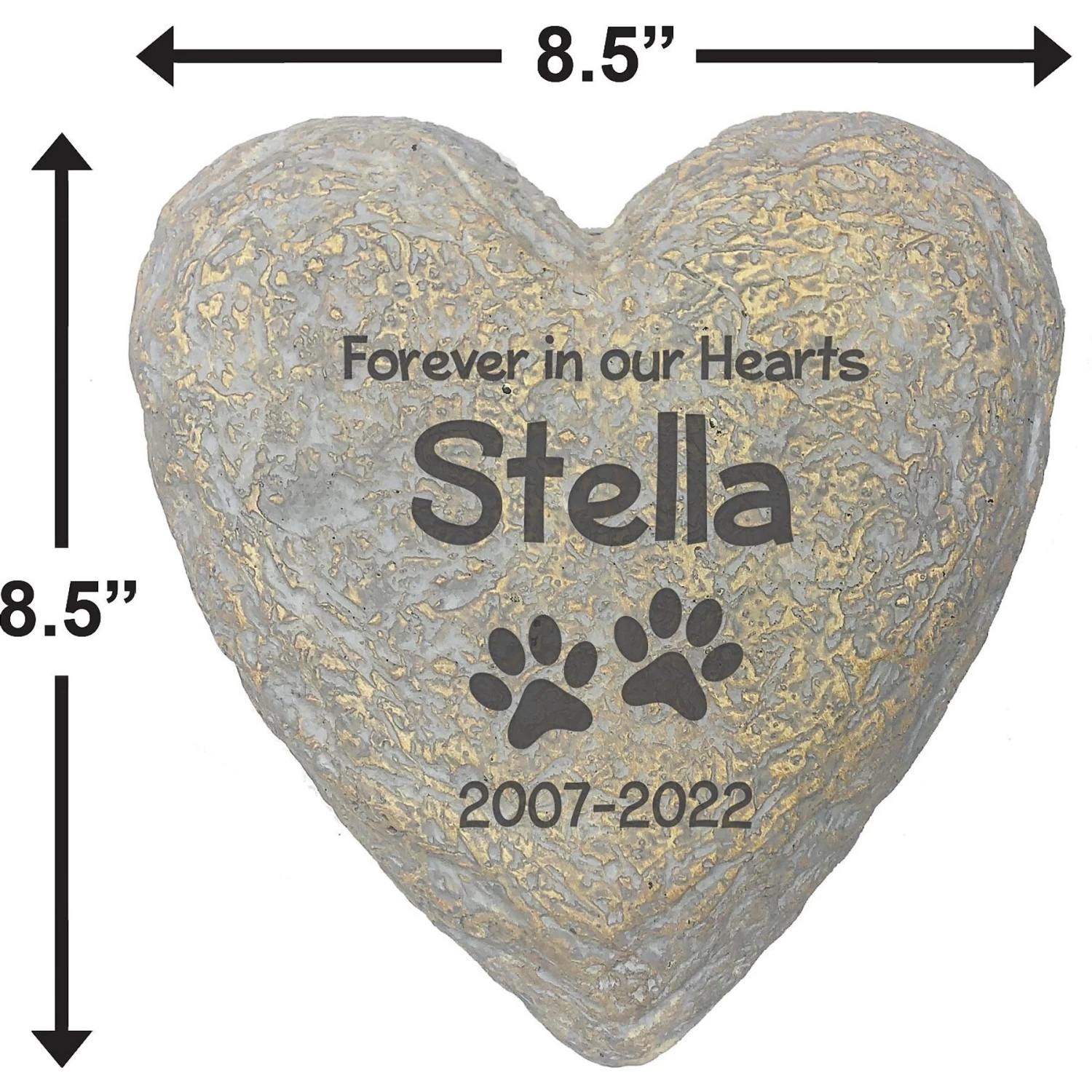 - Customize the stone with an engraving of your pet’s name and a date. Accompanying text says, “Forever In Our Hearts.”