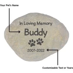- Customize the stone with an engraving of your pet’s name and a date. Accompanying text says, “In Loving Memory.”