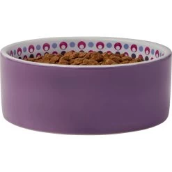 - Bright, poppy ceramic cat dish with solid purple around the outside.
