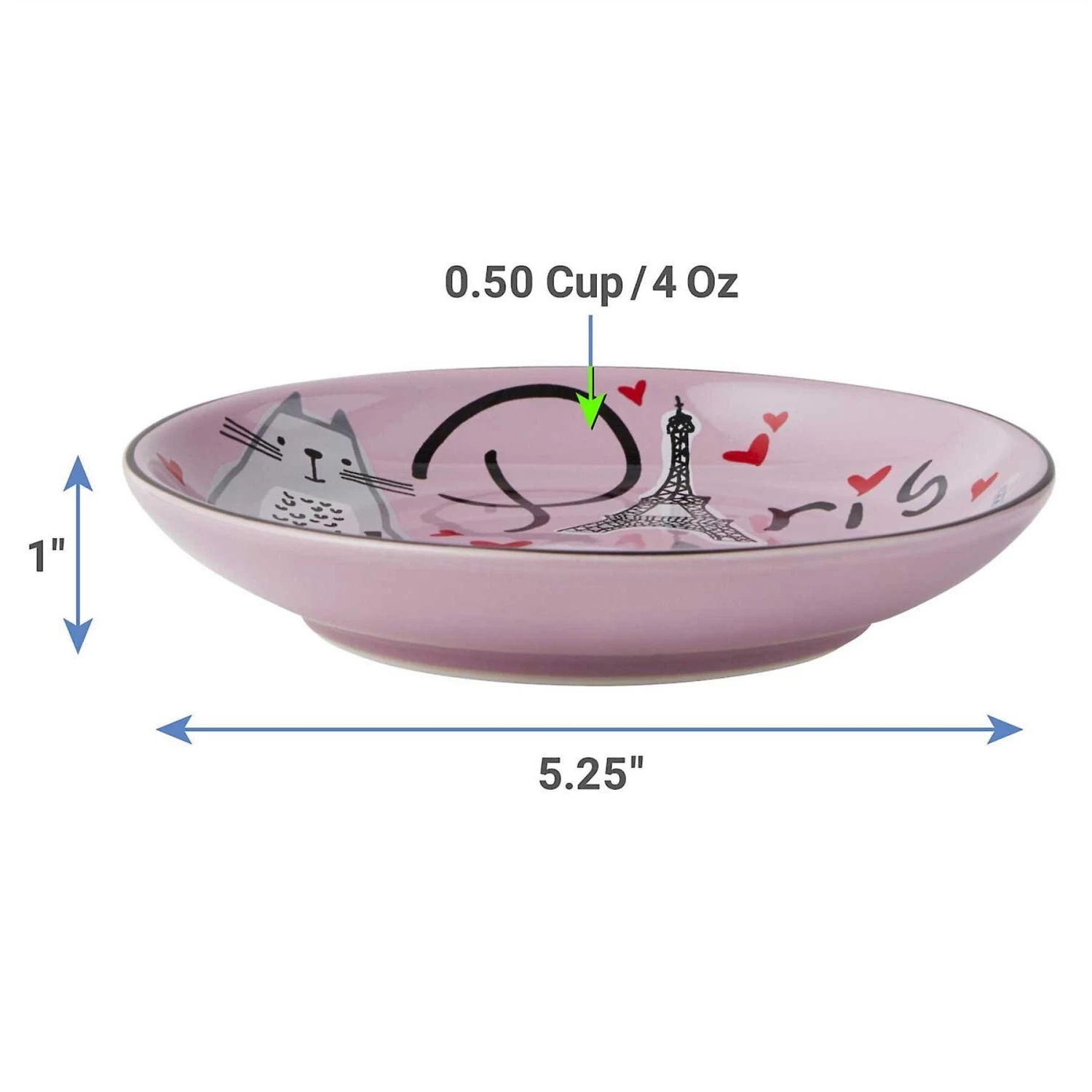 - Soft purple ceramic cat dish with a distinctive Paris-themed design outside and “kiss me” graphic inside.