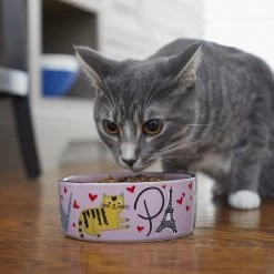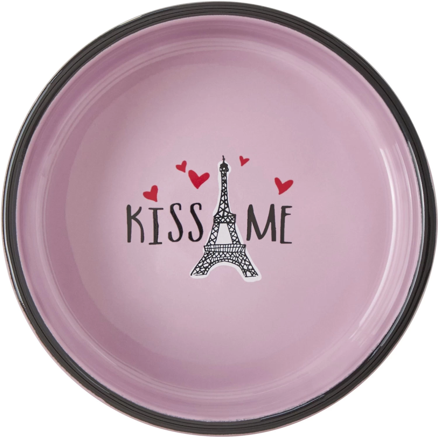 - Soft purple ceramic cat dish with a distinctive Paris-themed design outside and “kiss me” graphic inside.