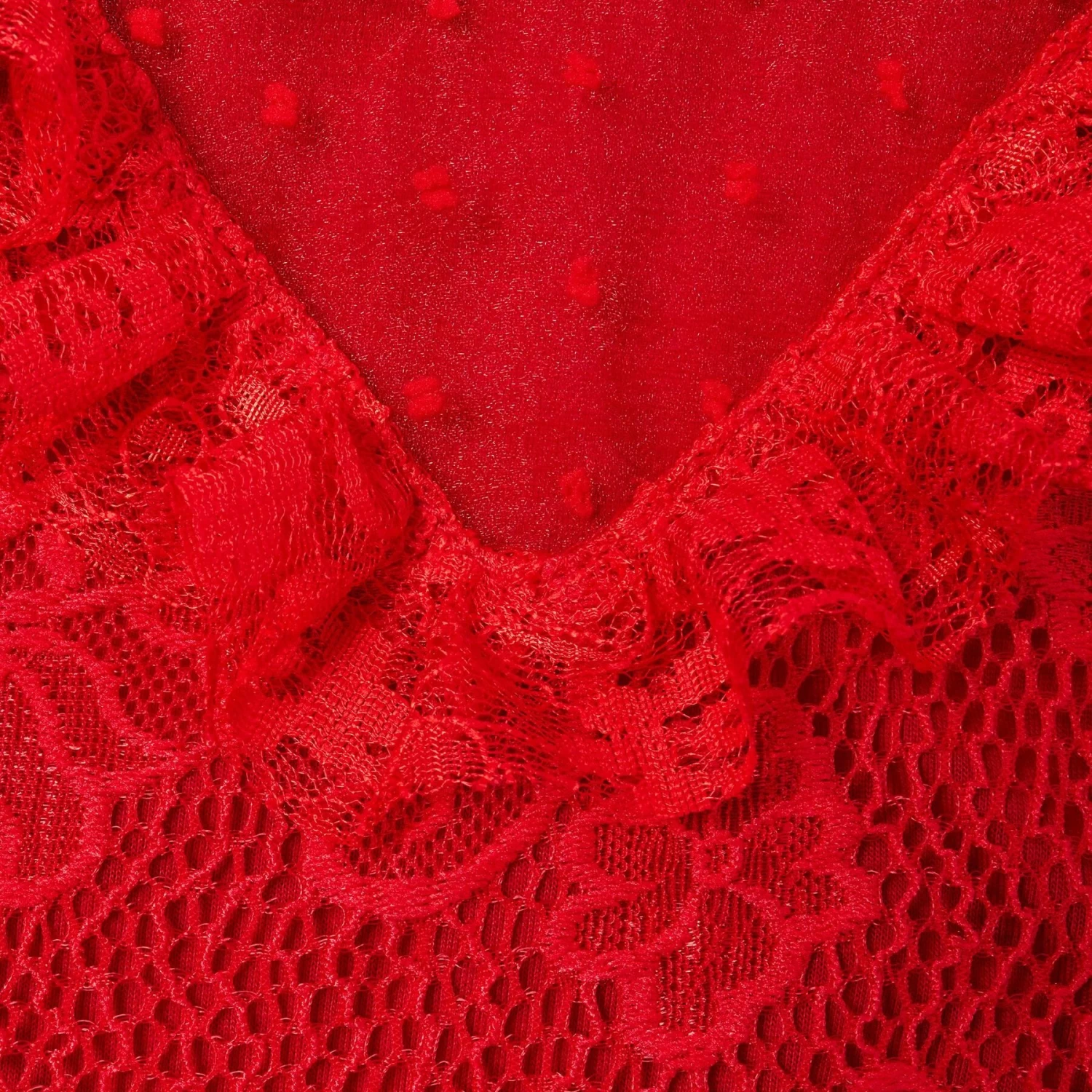 - Two-piece costume features a red top, layered mesh tulle skirt and a mesh veil headpiece.